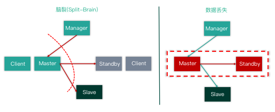 首先是集群脑裂,当一部分应用程序 Client 和 Master 形成内部网络,而 Manager、Slave、Standby 及其他 Client 端组成内部网络时。首先集群的复制状态中断,两边数据不一致。其次 Manager 会认为 Master 已经 Crash,会发起故障切换,例如将 Standby Master 提升为新主库,将 Slave 自动 change master 挂载到 Standby Master 节点下形成新的数据库集群。这时候集群一分为二,出现集群脑裂的故障。