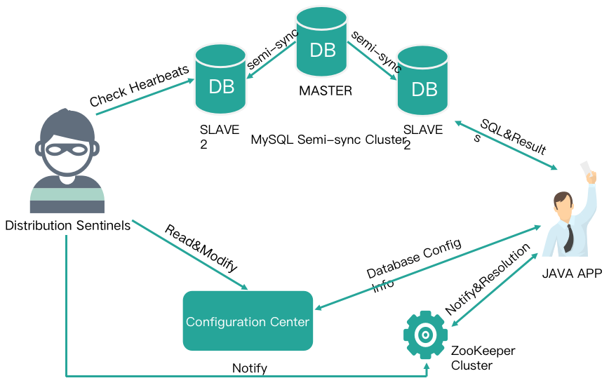分布式哨兵实时监控线上 MySQL 集群,当集群出现故障发生切换后,分布式哨兵会更新配置中心的配置(例如原 Master 下线,新 Master 下线),同时修改 namesapce 的版本信息来通知 ZK 集群信息发生变更。