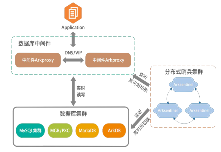 它可以支持 MySQL 全体系版本和所有的数据库架构(常用的 MS/MGR/PXC/MMM/ArkDB)等。通过数据库中间件提供透明读写分离及负载均衡,分布式哨兵集群对故障节点进行切换处理后告知数据库中间件后端集群最新的节点上下线信息,中间件支持动态 reload 后端集群配置及支持连接池的特性,能够对前端应用程序的连接进行平滑的迁移。