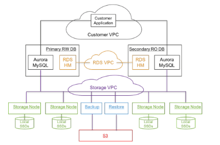 下图是 Amazon Aurora 的实现架构图,它使用了专门的 S3 存储及 RDS 组件,为了方便讲解,我们以 ArkDB 的架构为例讲解这类共享存储的 MySQL 高可用集群的实现方式。