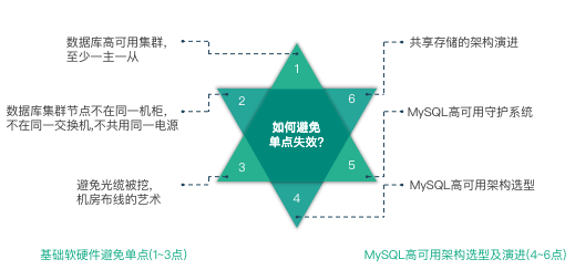 从两个方面了解 MySQL 如何避免单点失效,一方面是基础软硬件避免单点失效;另一方面是 MySQL 高可用架构选型及演进。