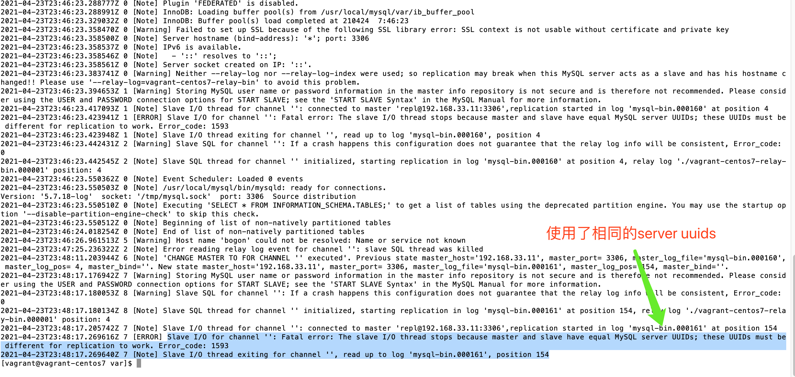 场景二:创建主从关系时copy了同样的my.cnf文件,报错