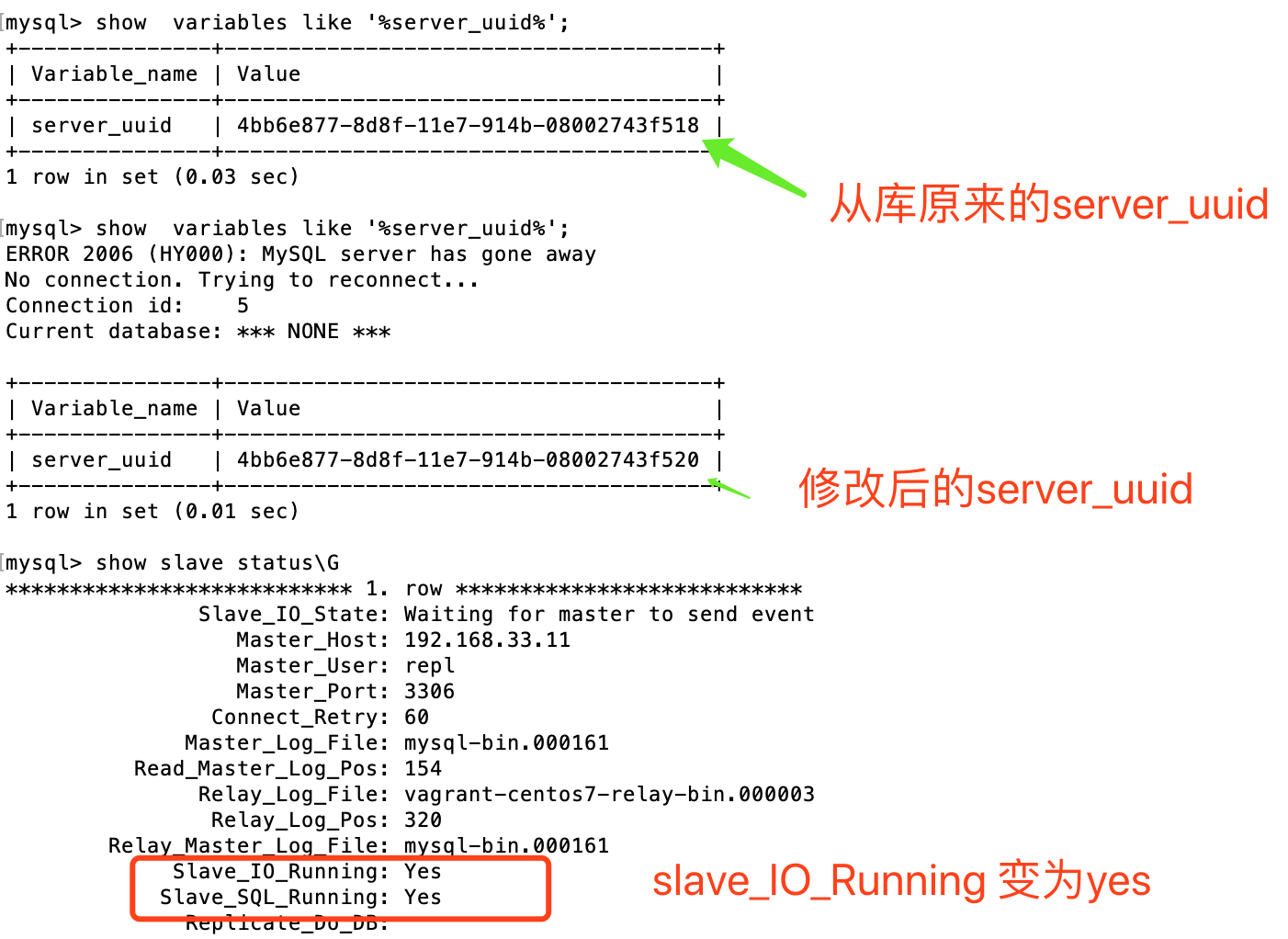 (1)相同的mysql server uuid, 导致slave_io_running:no