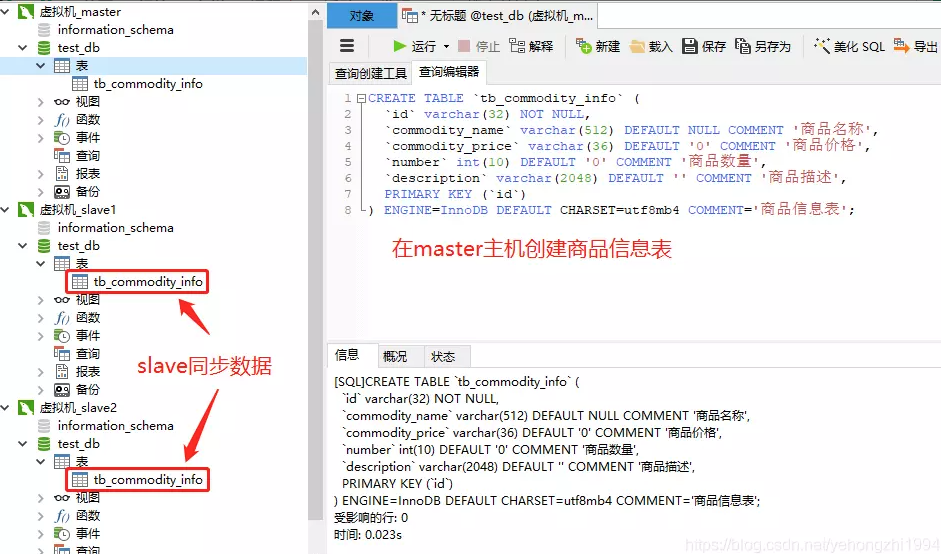 接着我们可以看到两台slave从机同步也创建了商品信息表: