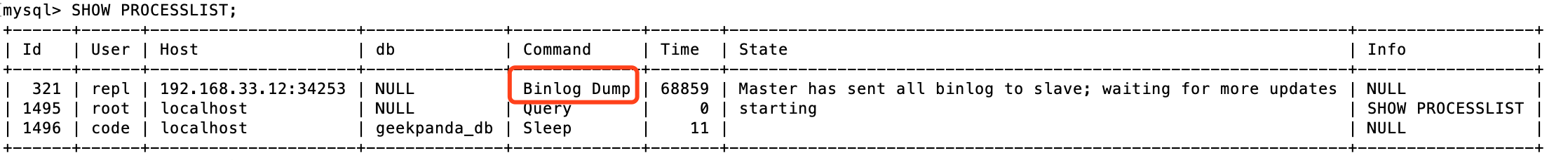 出现Command: Binlog Dump,则说明配置成功.