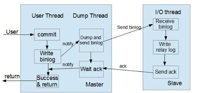 介于异步复制和全同步复制之间,主库在执行完客户端提交的事务后不是立刻返回给客户端,而是等待至少一个从库接收到并写到relay-log中才返回成功信息给客户端(只能保证主库的bin-log至少传输到了一个从节点上,但并不能保证从节点将此事务执行更新到db中),否则需要等待直到超时时间然后切换成异步模式再提交。相对于异步复制,半同步复制提高了数据的安全性,一定程度的保证了数据能成功备份到从库,同时它也造成了一定程度的延迟,但是比全同步模式延迟要低,这个延迟最少是一个TCP/IP往返的时间。所以,半同步复制最好在低延时的网络中使用。如下图所示: