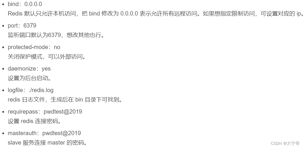 cluster-config-file nodes-6379.conf#修改监听端口0.0.0.0bind 0.0.0.0#设置本机密码requirepass 123456#设置主服务器密码(在集群中,这两个密码项非常重要,否则会导致主从数据不同步,并且不报错!!!)masterauth 123456