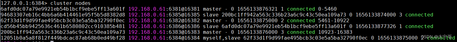M: 73a51b03d3ae1ae60573924a36e35a4160ea2a8a 192.168.1.9:6379 # M表示master 主节点,S表示slave 从节点