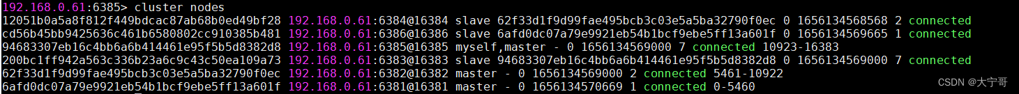 slots:5461-10922 (5462 slots) master ## slots是按照顺序分的,每台上的应该是差不多的,也会有原因导致无序分配,