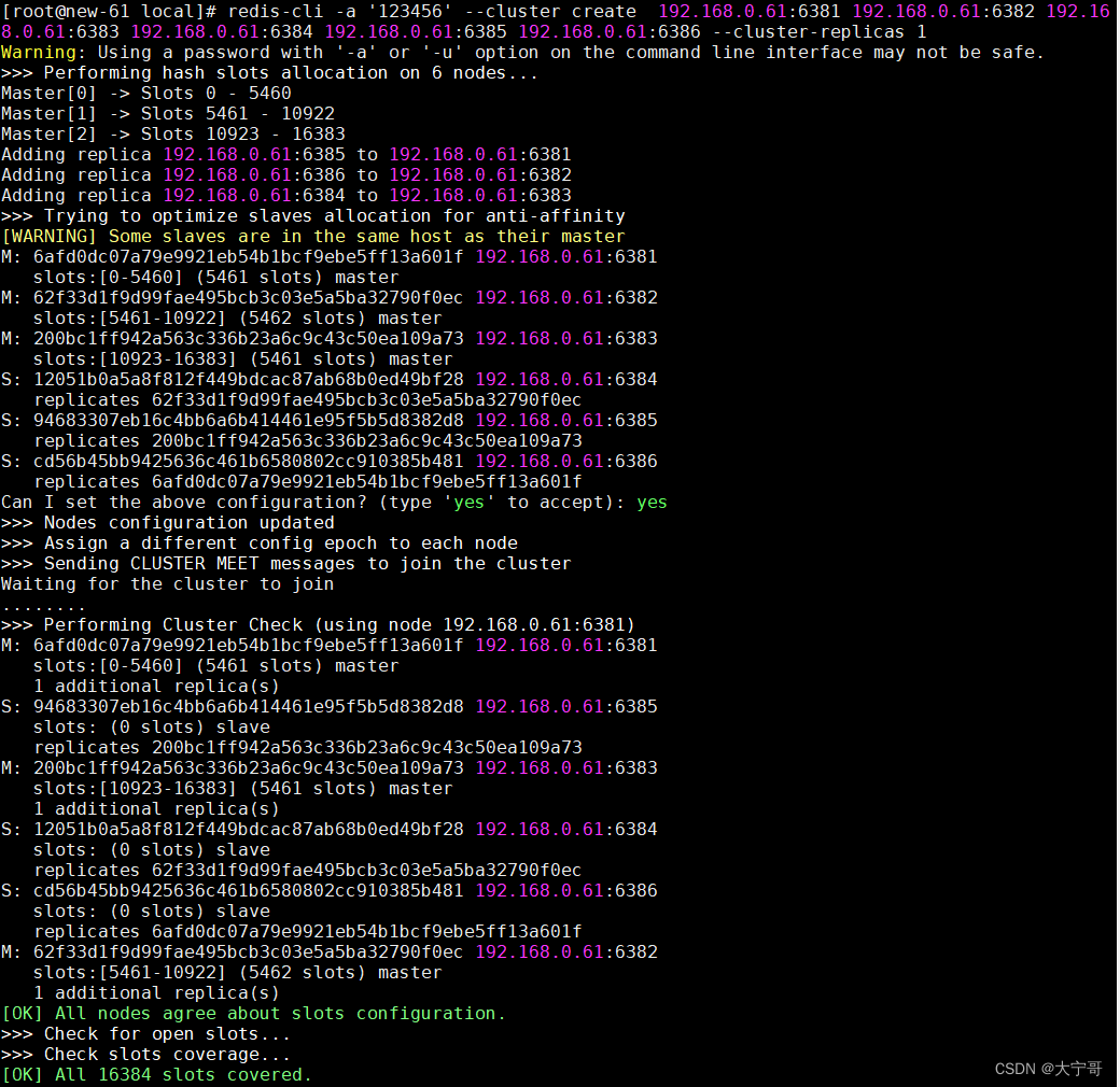 redis-trib.rb create --replicas 1 192.168.1.9:6379 192.168.1.8:6379 192.168.1.7:6379 192.168.1.6:6379 192.168.1.5:6379 192.168.1.4:6379
