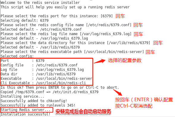 //如图所示,我们可以看见初始化配置参数。安装完成后Redis服务会自动开启