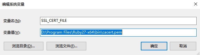 既然是证书有问题,那么直接更新gem ssl证书可否?带着这个疑问尝试了一下。首先下载证书, 下载完成后,配置环境变量配置环境变量 SSL_CERT_FILE如下: