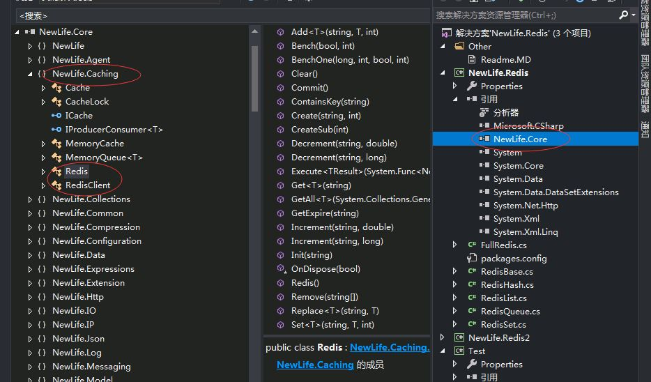 实际上NewLife.Redis是一个完整的Redis协议的功能的实现,但是redis的核心功能并没有在这里面,Redis的核心功能的实现是在NewLife.Core里面。这里可以打开看一下,NewLife.Core里面有一个NewLife.Caching的命名空间,里面有一个Redis类里面实现了Redis的基本功能,另一个类是RedisClient是Redis的客户端。Redis的核心功能就是有这两个类实现。RedisClient代表着Redis客户端对服务器的一个连接。