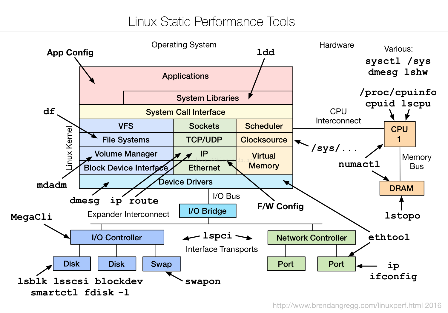 如下linux系统性能监控、测试和优化工具栈图谱是由系统性能专家 Brendan D. Gregg绘制的: