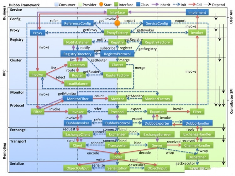 - 图中的 Consumer 和 Provider 是抽象概念,只是想让看图者更直观的了解哪些类分属于客户端与服务器端,不用 Client 和 Server 的原因是 Dubbo 在很多场景下都使用 Provider, Consumer, Registry, Monitor 划分逻辑拓普节点,保持统一概念。