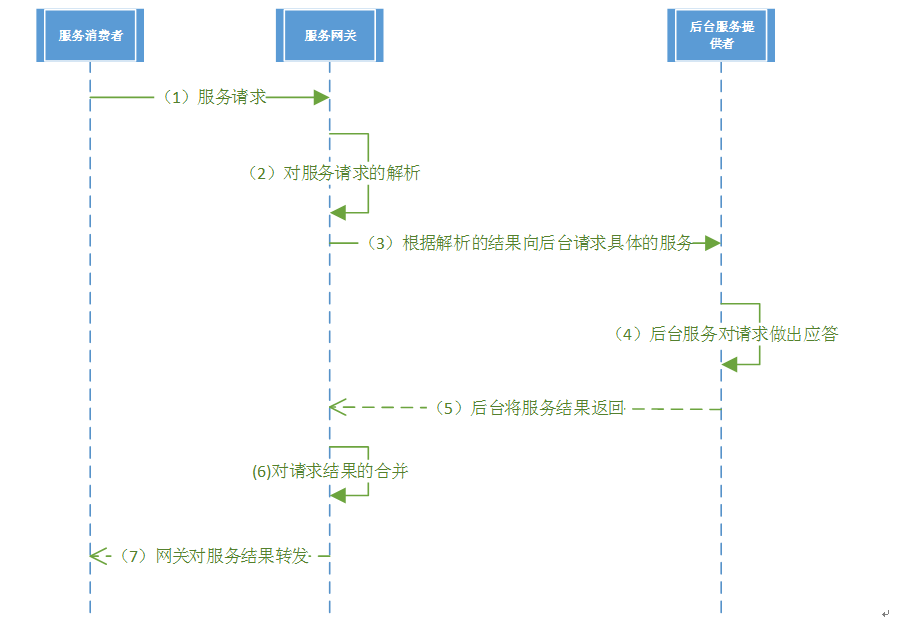 每个业务请求内可能包含对多个微服务的请求,API 网关收到服务请求后,对请求服务进行解析,并发对每个服务进行请求,每个服务的请求结果返回后,API网关对服务结果进行合并,将其返回给服务请求者。