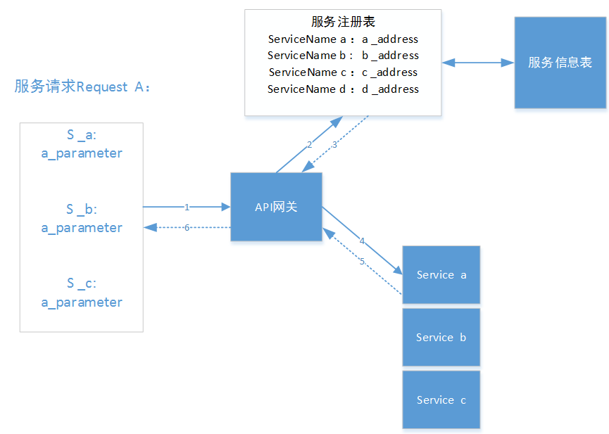 (1) 服务请求Request A 向 API网关发送服务请求信息,里面包括对三个服务的请求,及请求服务的名字和每个请求要用到的参数;