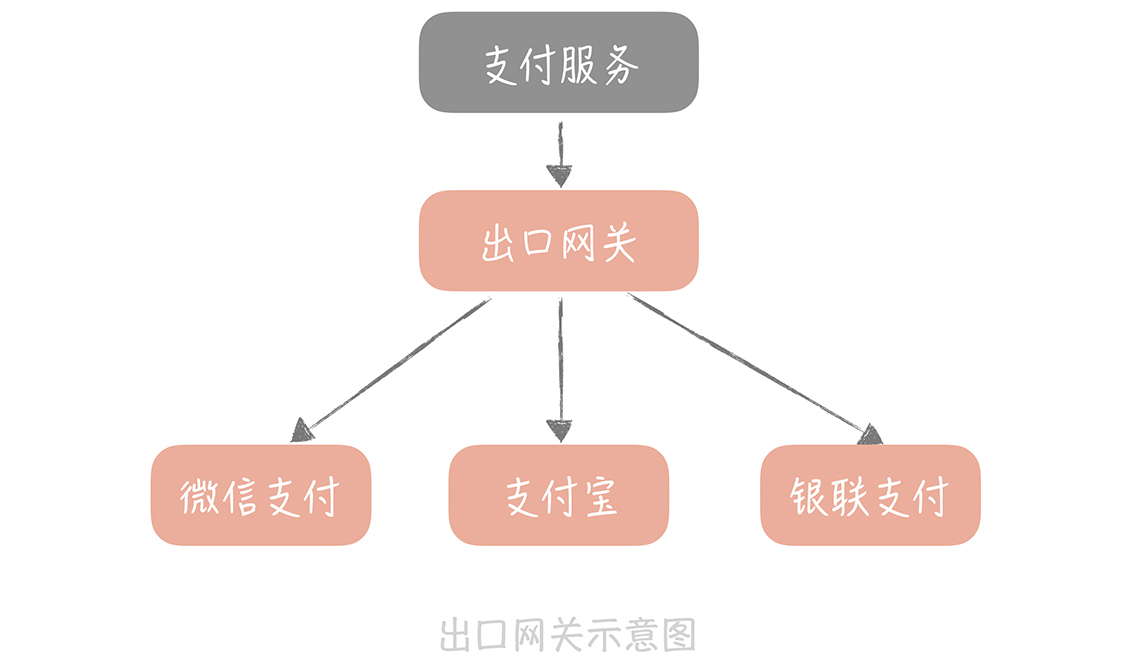 同时,我们可以在系统和第三方支付服务,以及登陆服务之间部署出口网关服务。原先,你会在拆分出来的支付服务中,完成对于第三方支付接口所需要数据的加密、签名等操作,再调用第三方支付接口,完成支付请求。现在,你把对数据的加密、签名的操作放在出口网关中,这样一来,支付服务只需要调用出口网关的统一支付接口就可以了。在引入了 API 网关之后,我们的系统架构就变成了下面这样: