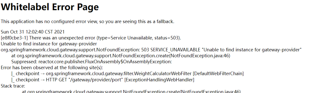 通过前面的测试可以看到一个现象:一旦路由的微服务下线或者失联了,Spring Cloud Gateway直接返回了一个错误页面,如下图: