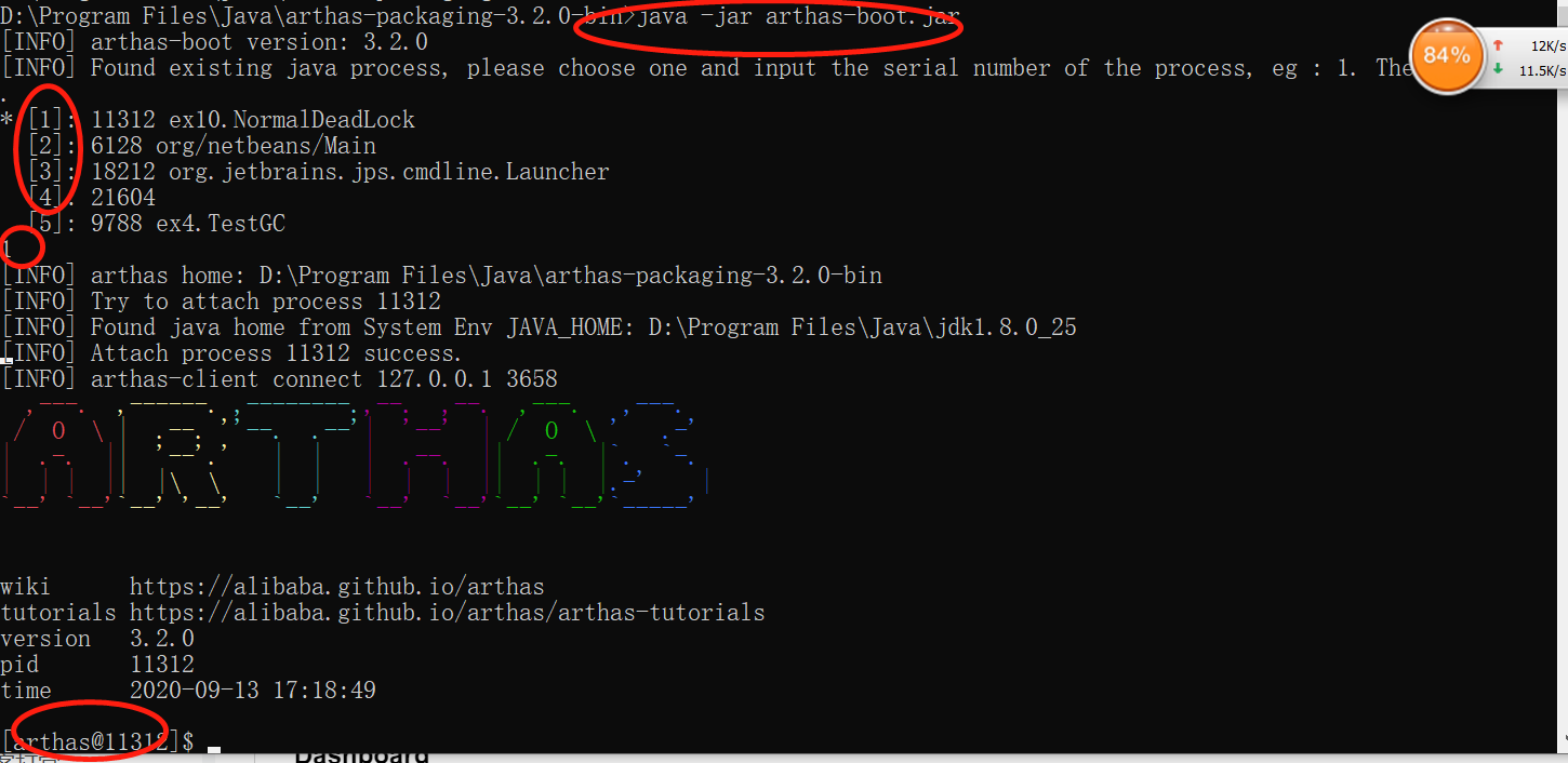 2、 通过 jps 命令快速查找 java 进程,再次直接绑定 java -jar arthas-boot.jar pid 启动 arthas 工具 attach 到目标进程
