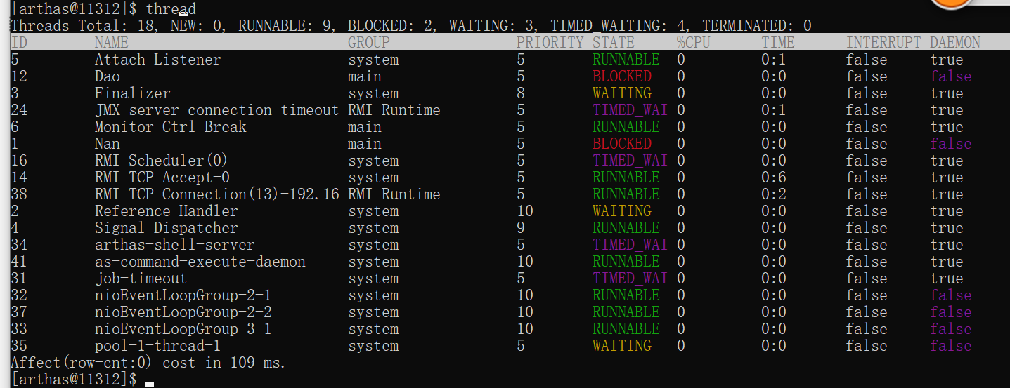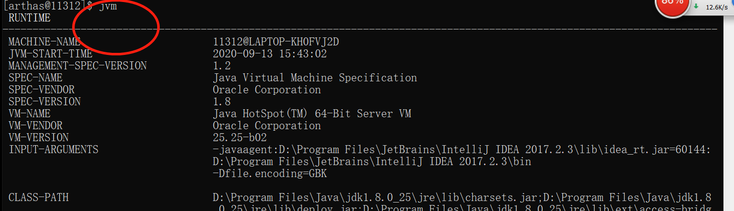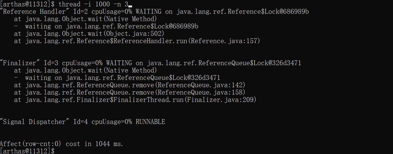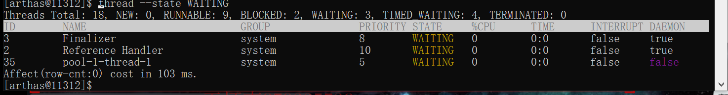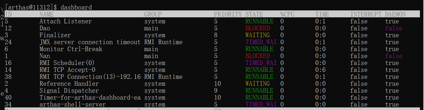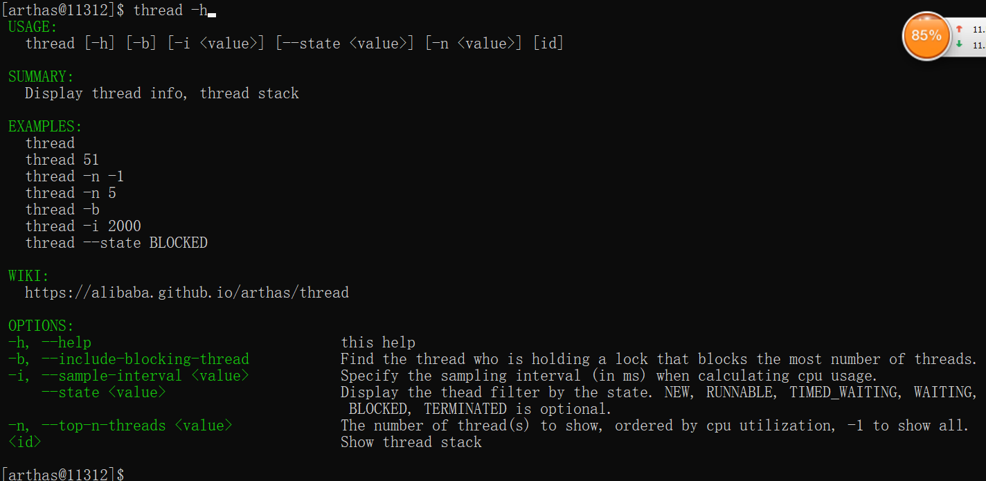 进入 arthas 后命令行前面出现标识 :[arthas@11312]$,都是很有规律的。
