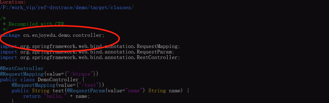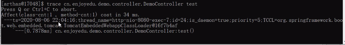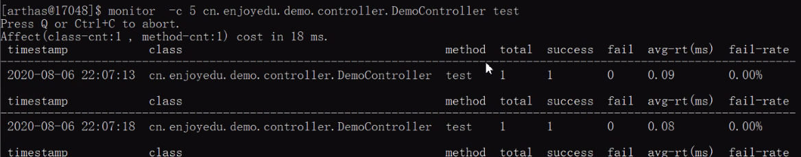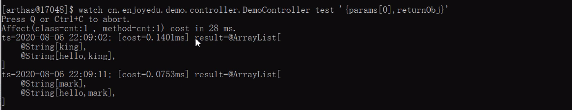 $ watch cn.enjoyedu.demo.controller.DemoController test '{params[0],returnObj}'