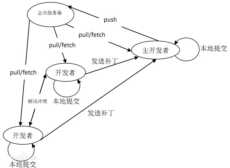 2.图中只显示了一般的使用流程,实际上,所有仓库之间都可以进行push和pull,即使不通过git,开发A也可以向开发B的仓库进行push或pull。