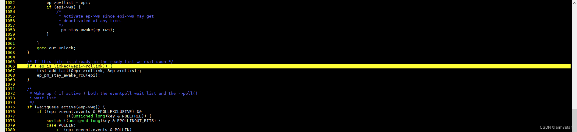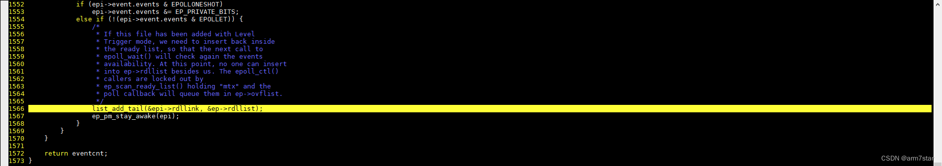 1554行检查是否是边沿触发EPOLLET,如果不是边沿触发,就执行if里面的代码,调用list_add_tail将epitem再次加入到就绪链表里面,也就是水平触发模式,epoll_wait获取到就绪事件之后并不会将就绪事件删除,用户程序获取到就绪事件之后,不管是接受所有连接还是接受部分连接,listen的socket还是"可读"的。
