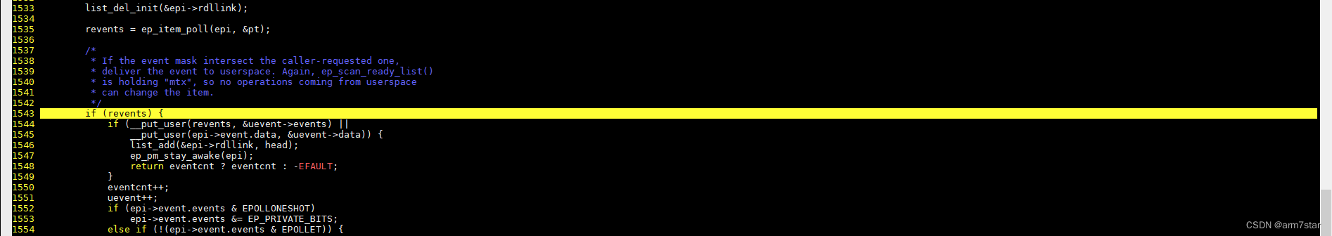 如上图代码1533行,这行代码将就绪epitem从就绪链表删掉,然后调用ep_item_poll检查获取该epitem的就绪事件,监听的就绪事件保存到revents,如果没有就绪的监听事件,那么revents就为0,1543行就是检查epitem是否有就绪事件,如果没有,那么if分支代码就不会执行(if代码块之后没有代码将epitem再次加入就绪链表),下次再次调用epoll_wait就不会再检查该epitem。