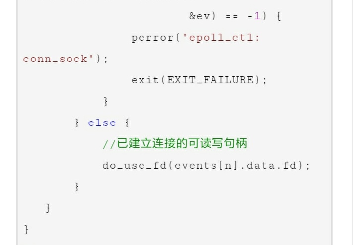 - 你拿着凭证在领取办公室门前等着,这时候广播喊xx班长你们班孙大熊的游泳卡办好了速来领取、李明实验室权限卡办好了速来取....还有同学的事情没办好,所以班长只能继续(也就是调用epoll_wait等待内核反馈的可读写事件发生并处理);