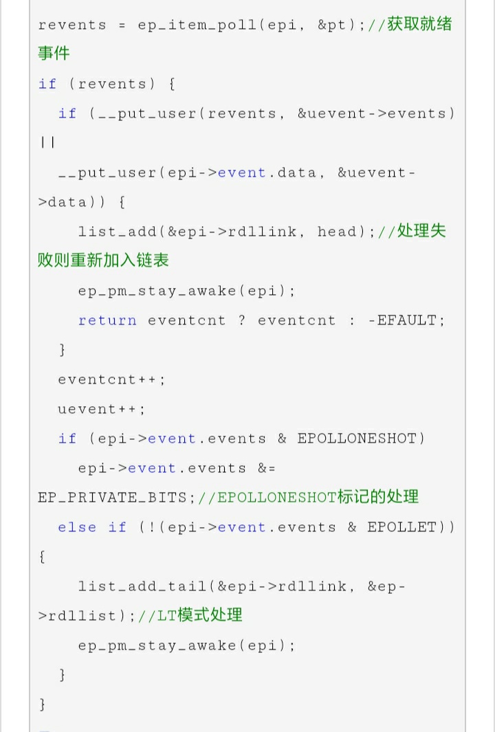 - ovflist主要是暂态处理,比如调用ep_poll_callback()回调函数的时候发现eventpoll的ovflist成员不等于EP_UNACTIVE_PTR,说明正在扫描rdllist链表,这时将就绪事件对应的epitem加入到ovflist链表暂存起来,等rdllist链表扫描完再将ovflist链表中的元素移动到rdllist链表中;