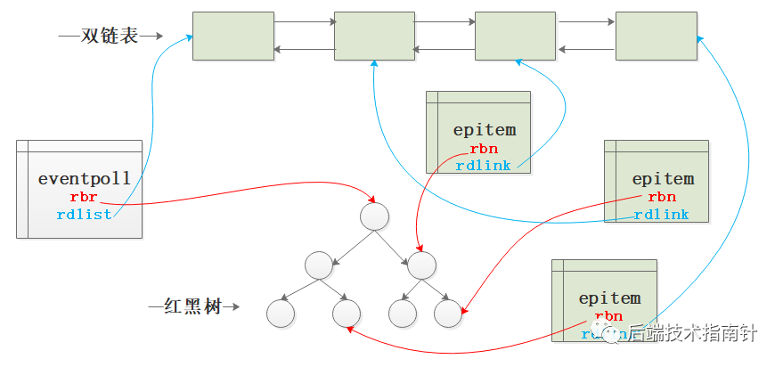 - 如图展示了红黑树、双链表、epitem之间的关系: