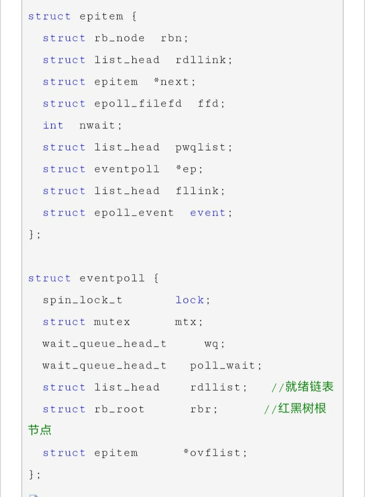 可以简单的认为epitem是和每个用户态监控IO的fd对应的,eventpoll是用户态创建的管理所有被监控fd的结构,详细的定义如下: