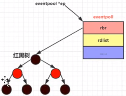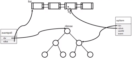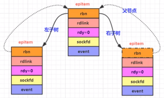 【原理】假设是ADD,先判断有没有这个key,生成一个epitem对象(一个结点),把socket和事件保存在结点中,把结点加入红黑树。每一个epi就是一个指向epitem的指针,rbn中有三个指针,分别指向左孩子、右孩子和父亲。