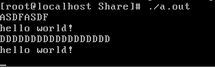(2) 输入两个”dd”,缓冲区中的数据变为”ddn”,select返回读就绪,read读出两个字符——”ss”,输出hello world!此时缓冲区中还有’n’,所以下一次select依然返回读就绪,之后read将’n’读出,输出hello world!,缓冲区清空,select阻塞。