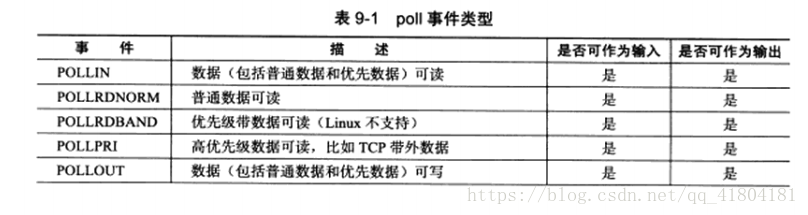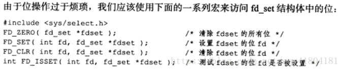 | 2、select API: int select(int nfds,fd_set *readfds,fd_set *writefds,fd_set *exceptfds,struct timeval * timeout); 从左到右参数依次为被监听的文件描述符的总数、可读、可写、异常事件对应的文件描述符的集合。 fd_set结构体仅包含一个整型数组,该数组的每个元素的每一位都标记了一个文件描述符。没有将文件描述符和事件绑定,不能处理更多类型的事件,另一方面由于内核对fd_set的在线修改,应用程序下次调用select得对这3个参数进行重置。 如果在超时时间内没有任何就绪事件则selet返回0.失败返回-1并设置errno值。 | 2、pool API: int poll(struct pollfd *fds,nfds_t nfds,int timeout); fds是一个pollfd结构类型的数组,他指定所有我们感兴趣的文件描述符的可读、可写、和异常事件等。(fds和下面的的fd意义不同fd是特定的)