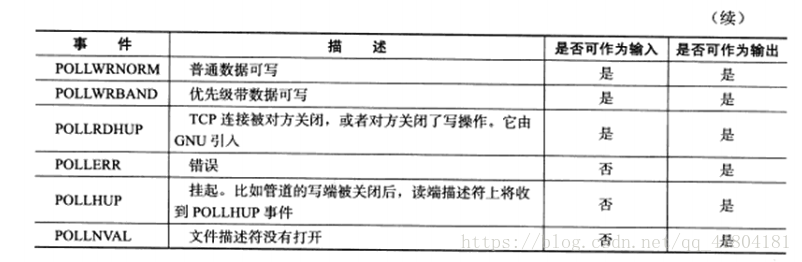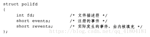 fd成员指定文件描述符;events策划哪个院告诉poll监听fd上的哪些事件,它是一系列事件的按位或;revents则成员则有内核修改,已通知fd实际发生了哪些事件。将文件描述符和事件绑定,任何事件都被统一处理。并且每次内核修改的都是revents成员,events成员不变,下次调用poll时无需重置pollfd的事件集参数。