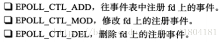 1、epoll需要一个额外的文件描述符,来唯一标识内核中的这个事件表。这个文件描述符使用如下函数创建。 int epoll_create(int size) size只是给内核一个提示,告诉它事件表需要多大。该函数返回的文件描述符将用作其他所有epoll系统调用的第一个参数,以指定要访问的内核事件表。 2、下面函数用来操作内核事件表: int epoll_ctl(int epfd,int op,int fd,struct epoll_event *event) (1)fd参数是要操作的文件描述符,op参数指定操作类型,有如下三种: