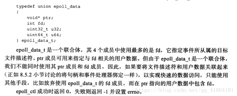 ①event成员描述事件类型。epoll支持的事件类型和poll基本相同。表示epoll事件类型的宏就是在poll相对应得宏前面加上“E”。epoll有两个额外的事件类型——EPOLLET和EPOLLONESHOT。他们对于epoll高效运作非常关键。 ②data用于存储用户数据。epoll_data_t的定义如下: