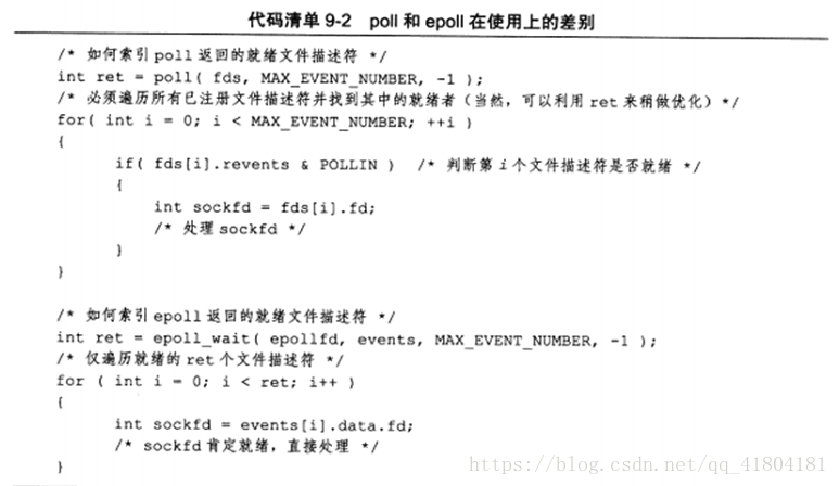 epoll_wait函数调用后就返回了所有的就绪文件描述符,而poll还需要遍历所有的已注册的文件描述符并找到其中的就就绪者。 |