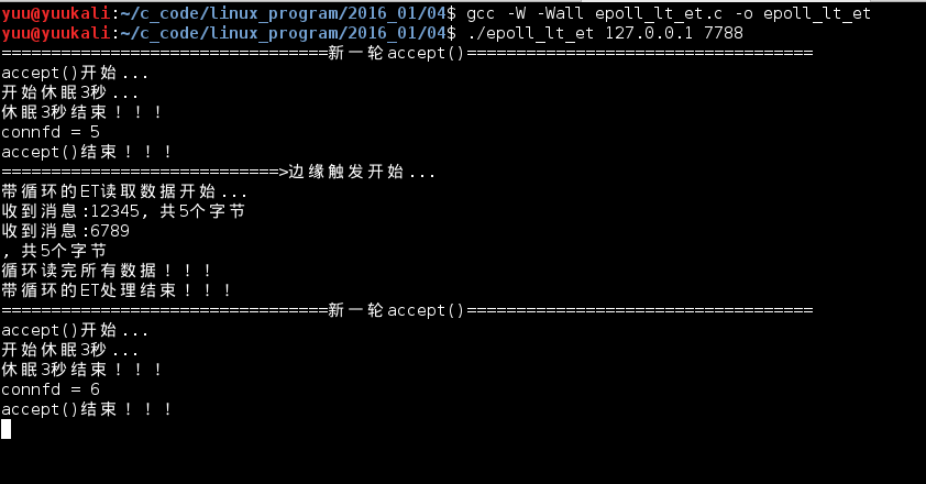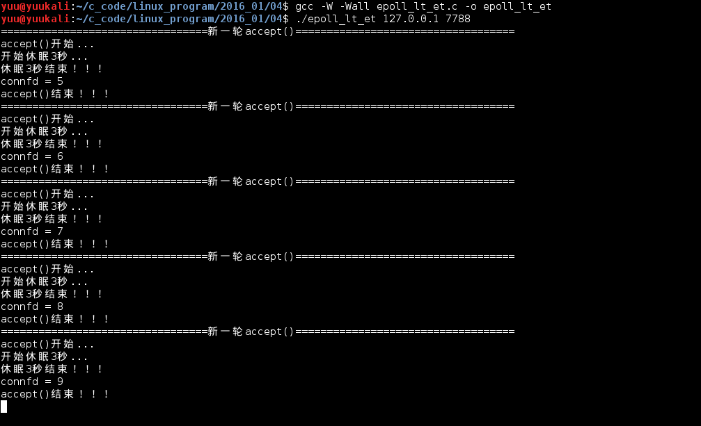 以上没有验证阻塞的sockfd,因为epoll_wait()返回必定是已就绪的连接,设不设置阻塞accept()都会立即返回。例外:UNP里面有个例子,在BSD上,使用select()模型。设置阻塞的监听sockfd时,当客户端发起连接请求,由于服务器繁忙没有来得及accept(),此时客户端自己又断开,当服务器到达accept()时,会出现阻塞。本机测试epoll()模型没有出现这种情况,我们就暂且忽略这种情况!!!
