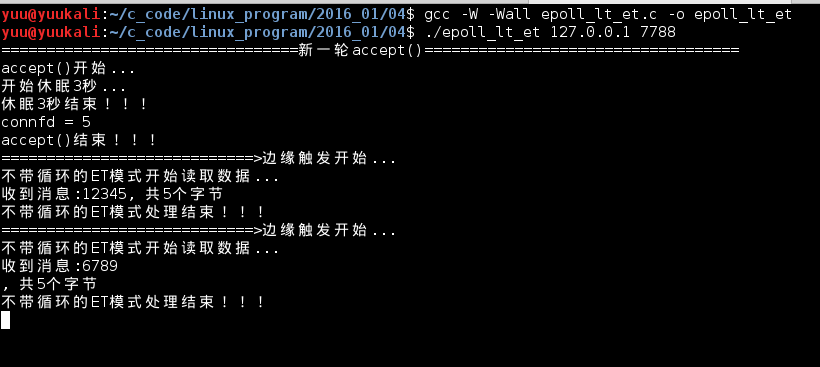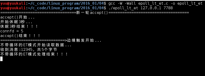 细心的朋友肯定发现了问题,程序没有输出"带循环的ET处理结束",是因为程序一直卡在了88行的recv()函数上,因为是阻塞IO,如果没数据可读,它会一直等在那里,直到有数据可读。如果这个时候,用另一个客户端去连接,服务器不能受理这个新的客户端!!!