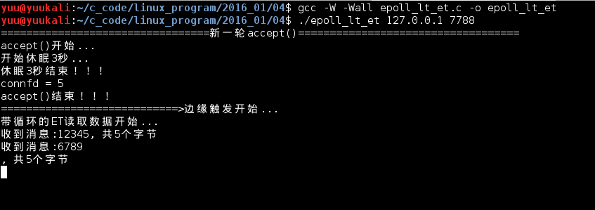 再看服务器的反映,可以看到水平触发触发了2次。因为我们代码里面设置的缓冲区是5字节,处理代码一次接收不完,水平触发一直触发,直到数据全部读取完毕: