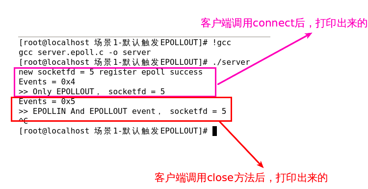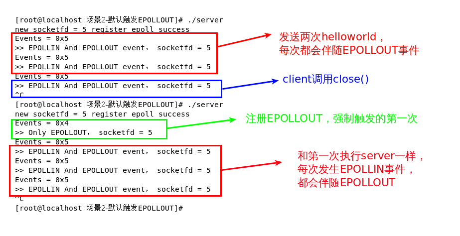 输出结果:执行了两次,两次基本相同,只不过是第二次多出现一个Only EPOLLOUT。