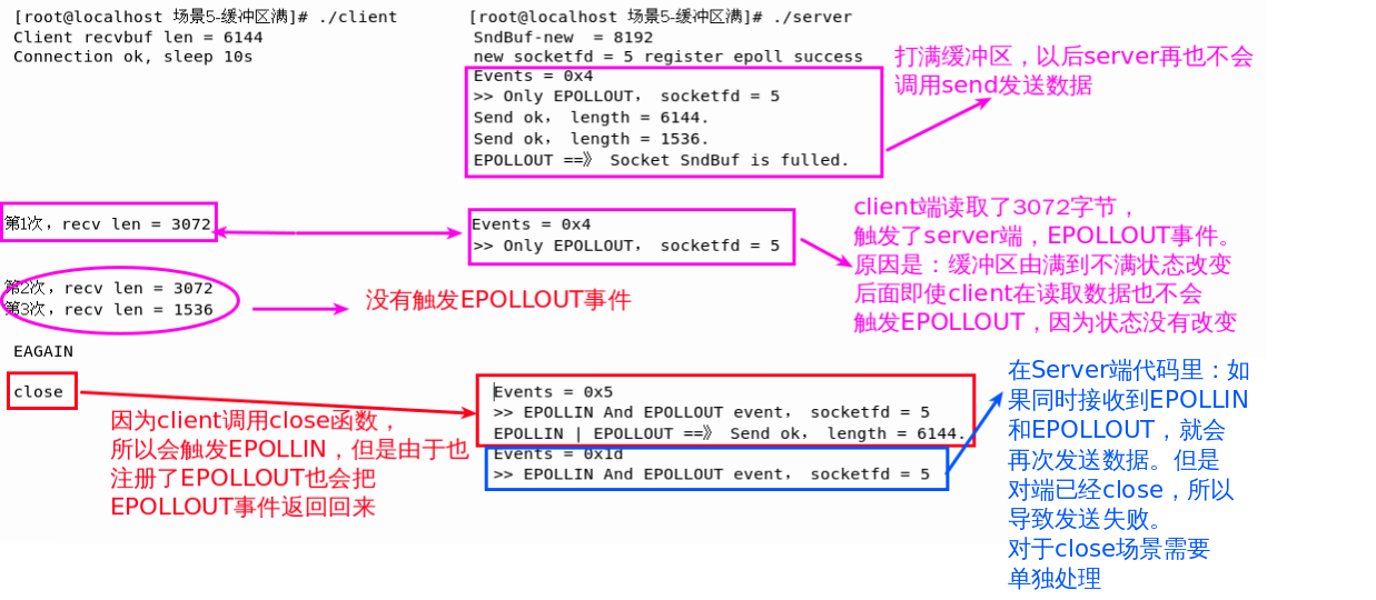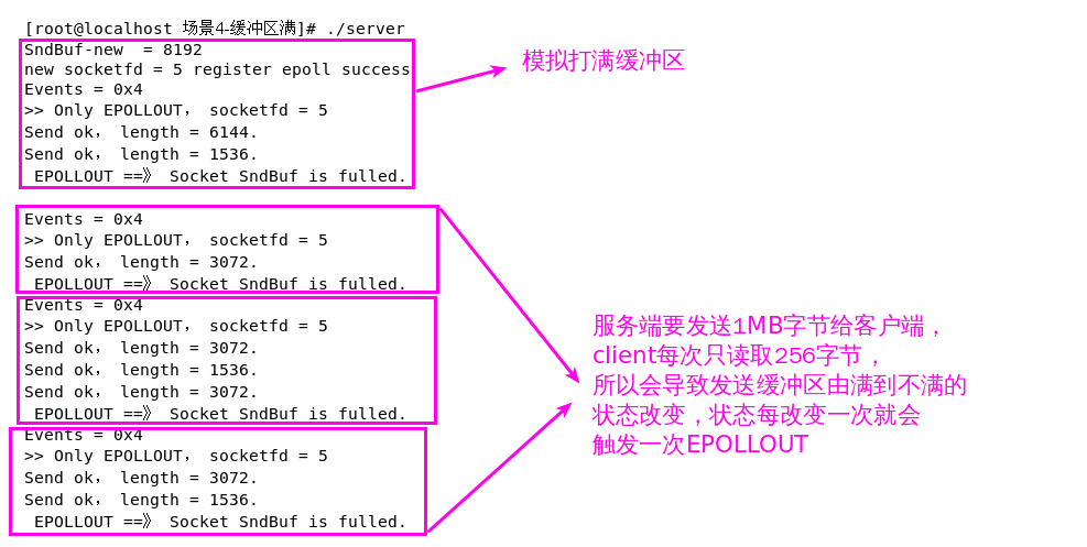 没有EPOLLOUT,原因是发送缓冲区是满的,不可写,所以不会触发EPOLLOUT。