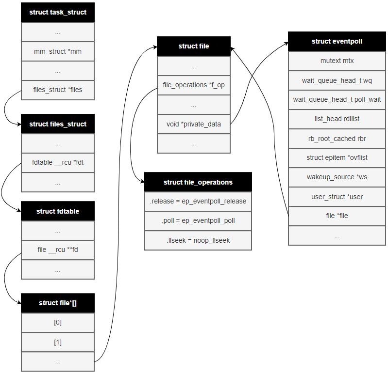- 新创建的struct file就是epoll 文件,其中的private_data 指向eventpoll 这个epoll 的核心结构体;