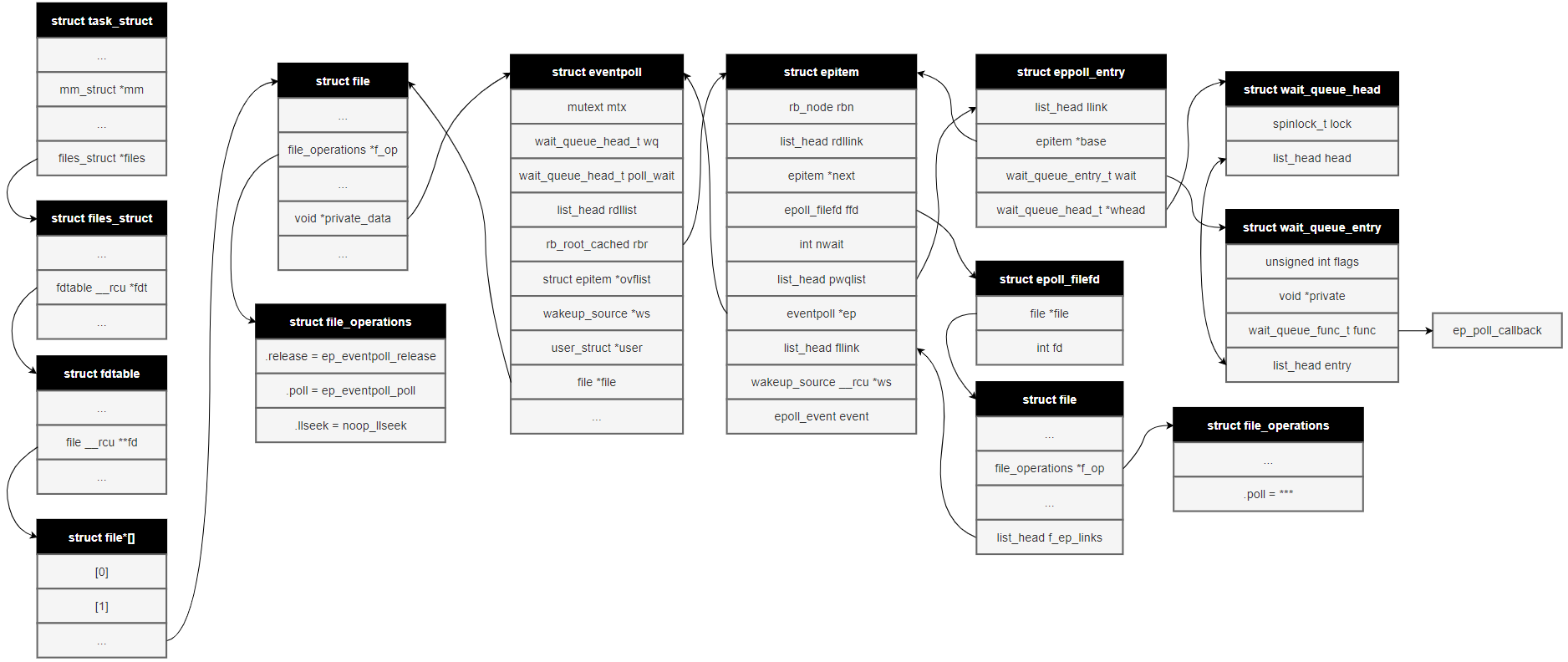 Epoll在linux内核中源码主要为 eventpoll.c 和 eventpoll.h 主要位于fs/eventpoll.c 和 include/linux/eventpool.h, 具体可以参考Linux 5.4源码,下述为部分关键数据结构摘要, 主要介绍epitem 红黑树节点 和eventpoll 关键入口数据结构,维护着链表头节点ready list header和红黑树根节点RB-Tree root。