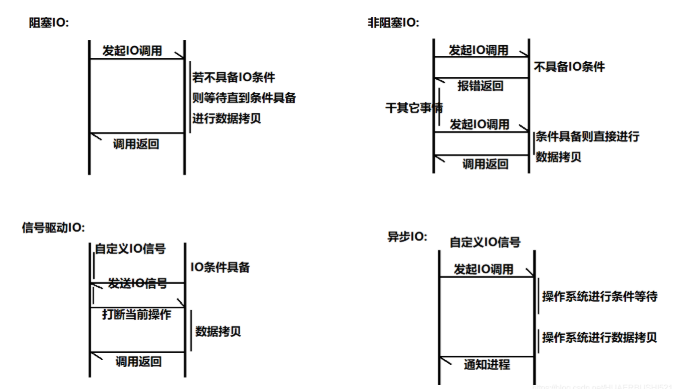 - 信号驱动IO: 内核将数据准备好的时候,使用SIGIO信号通知应用程序进行IO操作