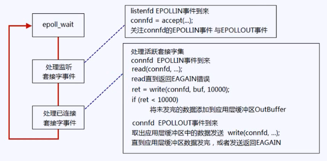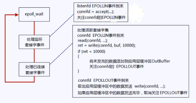 只能等到一次没有发送完的时候,才关注EPOLLOUT事件,如上图所示。而且要记得,应用层缓冲区中的数据发送完毕之后,要取消关注EPOLLOUT。