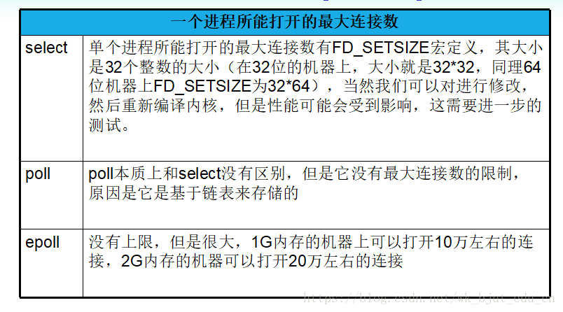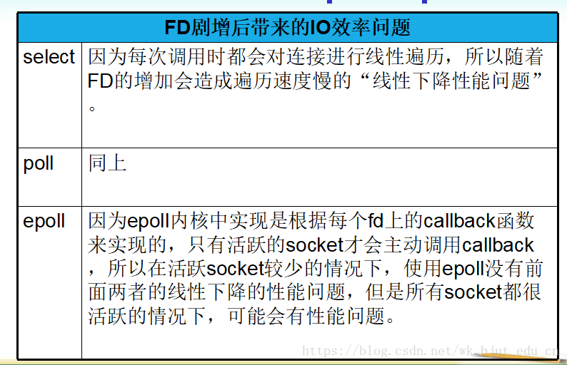相比于select与poll,epoll最大的好处在于它不会随着监听fd数目的增长而降低效率。
